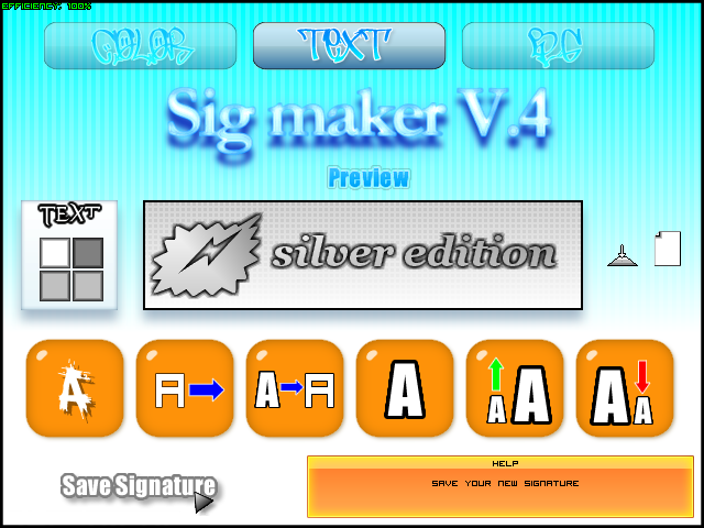 Description: Sig Maker V.4 is the fourth model of my freeware software that allows you to make your own custom sigs without any knowlege of image editing! If you want to download the newer version, please go here - Signature maker V.5