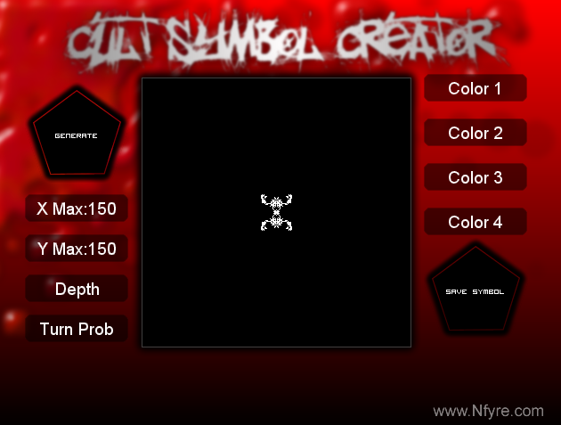 Description: This is a generator to create symmetrical cult symbols! This was originally a program I made on my TI-83 to design an evil organizational symbol for one of my games, but since it was way too slow, I decided to transfer it to the computer. Since it turned out so well, I decided to fix up a few things and release it! So enjoy! (Note: This uses surfaces, so many older computers will not be able to run it)
